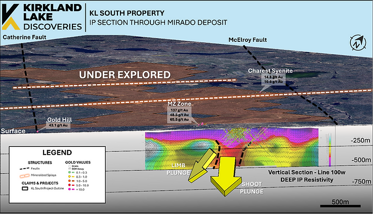 Figure 2 – Plan View of KL South including the Mirado mine. Multiple high-grade gold showings at surface have limited drilling to test subsurface.