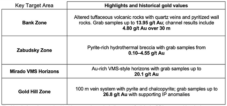 Table 2 -Mirado Project Key Target Areas – with historical gold values